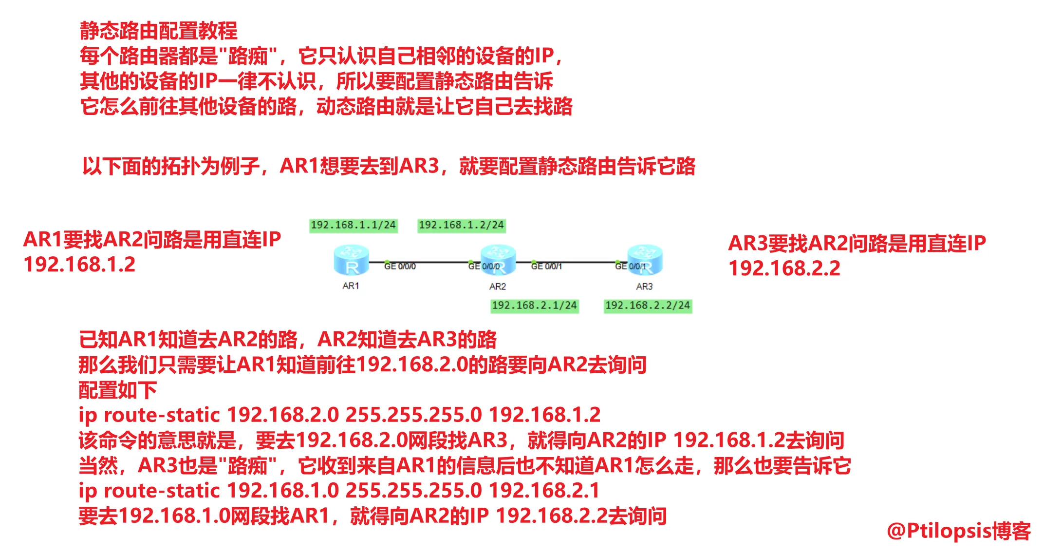 注意:ip route-static [要前往的地址] [地址掩码] [下一跳的地址]