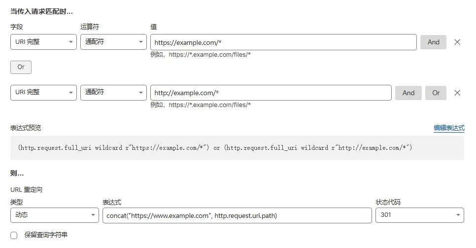 Cloudflare带URL将地址从@跳转到任意子域方法 2026-3-17 15:45 | 297 | 1 | 学习笔记 81 字 | 1 分钟内 非常简单的配置,在Cloudflare - 域 - 规则 - 重定向规则 中配置以下内容: 注意添加 Or 配置 https 和 http 的匹配,避免某些浏览器莫名其妙访问 http(说的就是你Edge) 注意规则顺序放在第一位