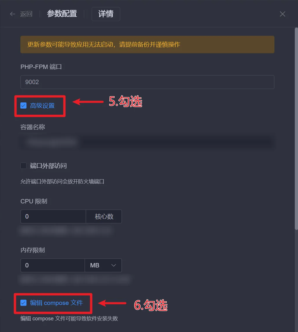 创建好伪授权站点后,找到需要授权的站点(应用商店 - 已安装 - 要授权的站点 - 参数 - 编辑 - 高级设置 - 编辑compose文件)