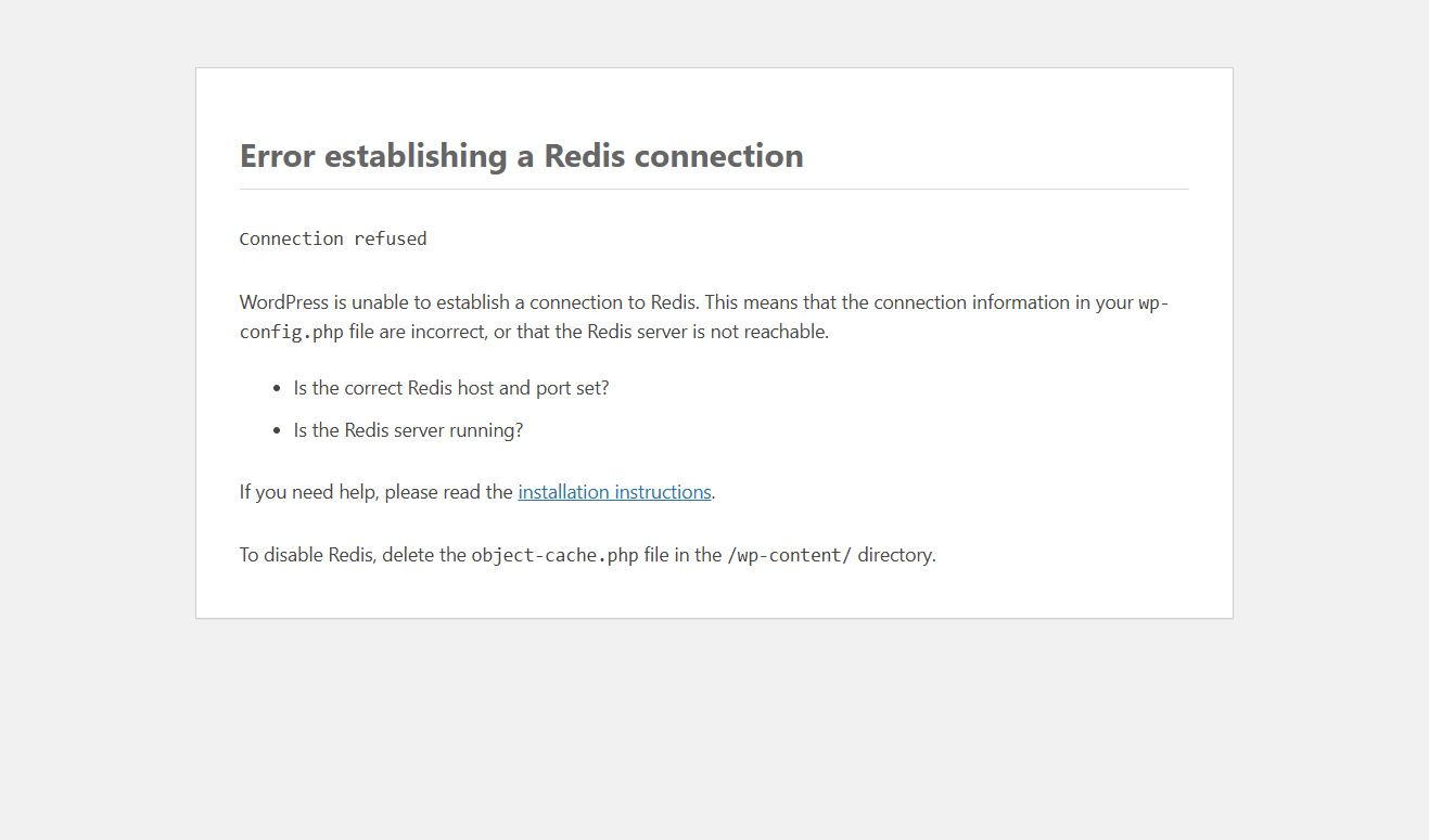 这是因为激活Redis Object Cache后生成的主要配置文件指向的数据库位置仍然是默认的127.0.0.1,所以会导致错误,将其修正回正确地址即可。